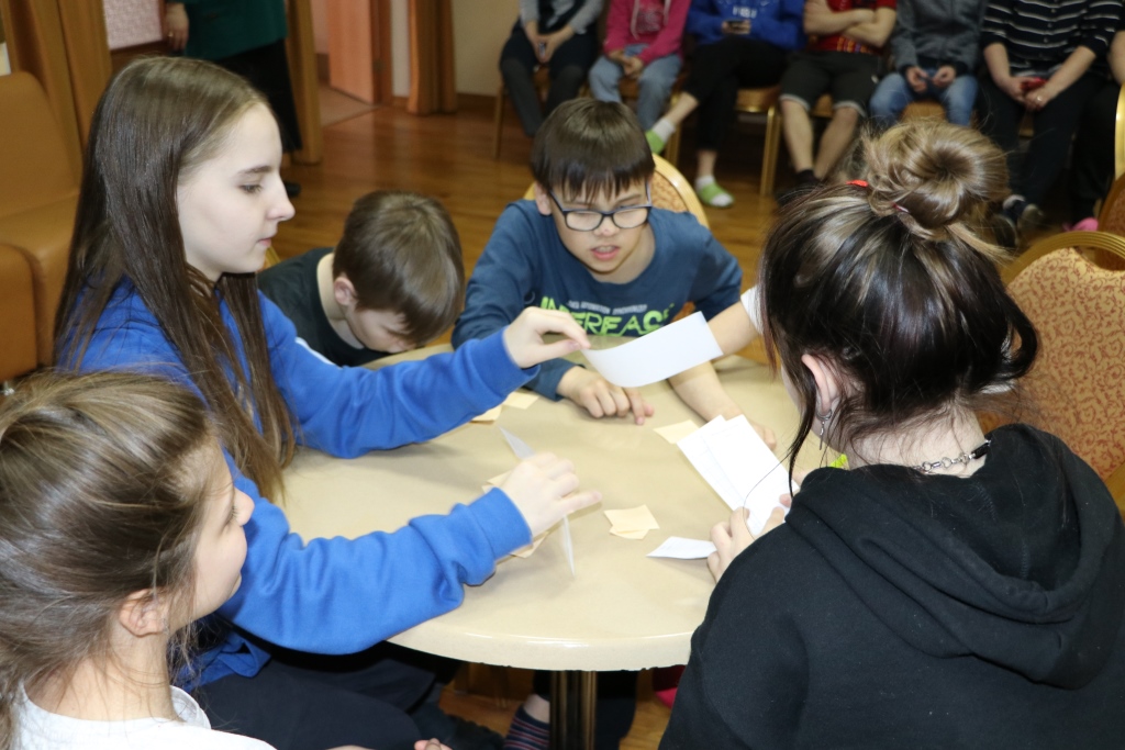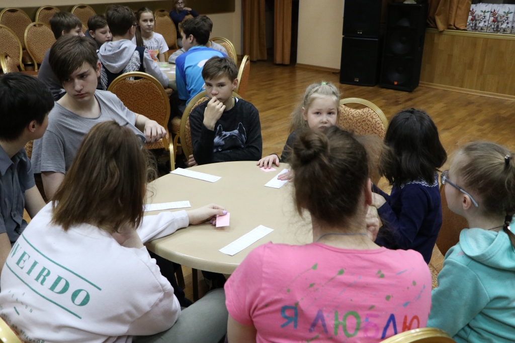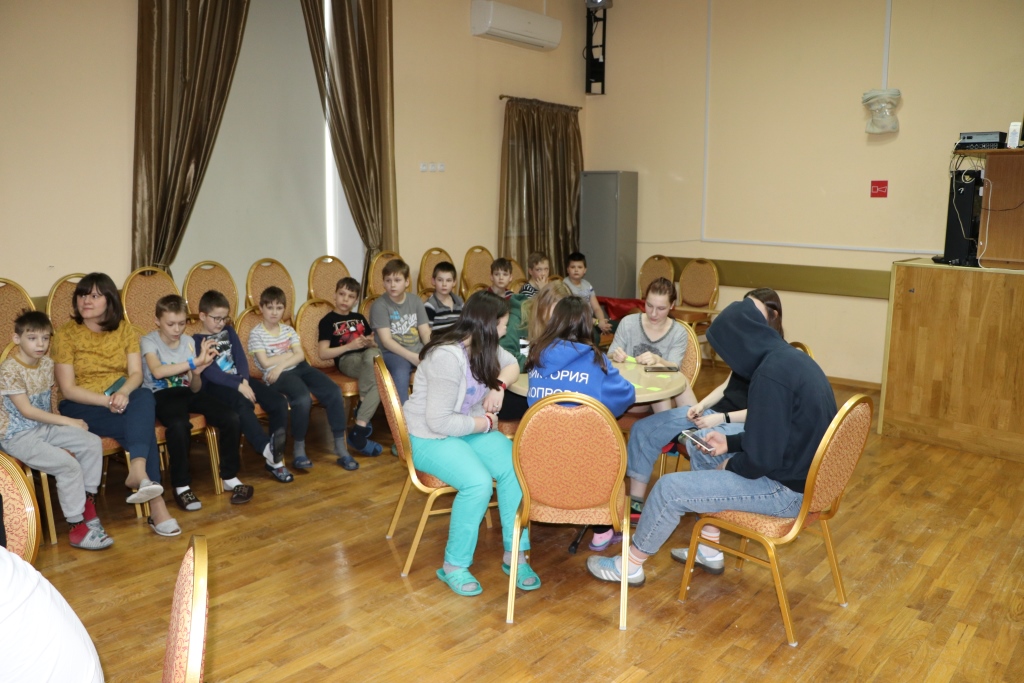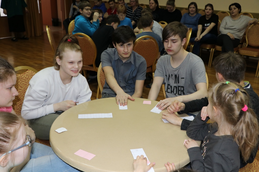 Всех участников игры путем жеребьевки разбили по командам, получилось 6 команд – 2 старших детей и 4 среднего школьного возраста. Каждая команда придумала название и выбрала капитана. Вопросы были разбиты на 6 блоков: блок музыки, кино, мультфильмов, истории, географии и т.д. Сами вопросы были разной степени сложности. У детей закипали мозги! Но они дружно обсуждали варианты ответов в командах и справились с заданиями. Победителей ждали призы! Все ушли воодушевленные своими знаниями!